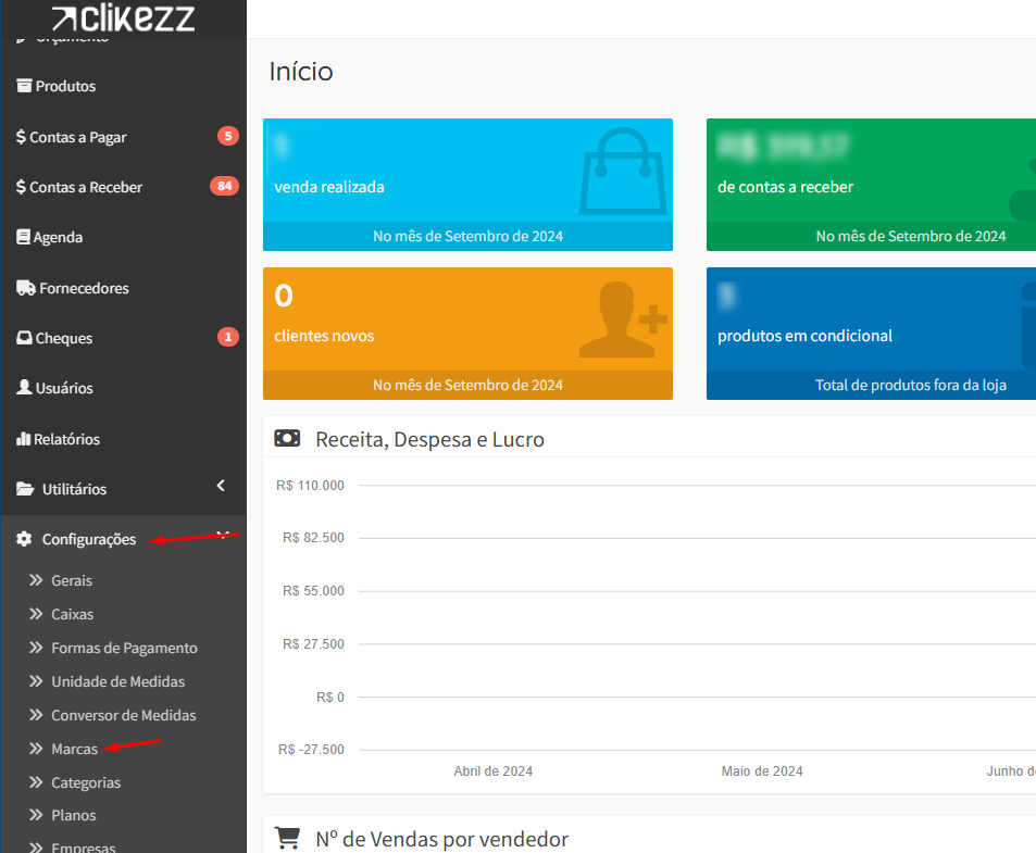 Para cadastrar uma marca no sistema, primeiro acesse Configurações e depois clique em Marcas