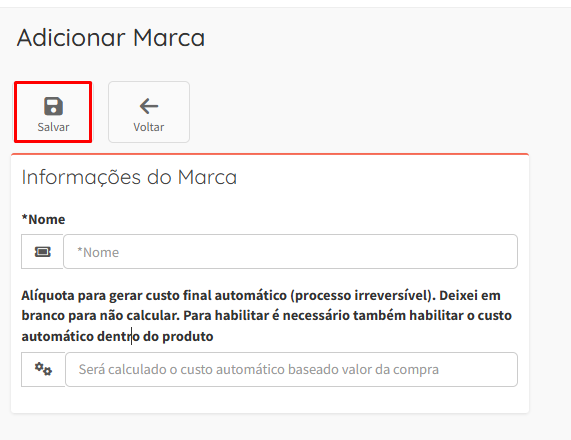 Preencha as informações da Marca como nome e/ou alíquota para gerar custo e clique em Salvar.