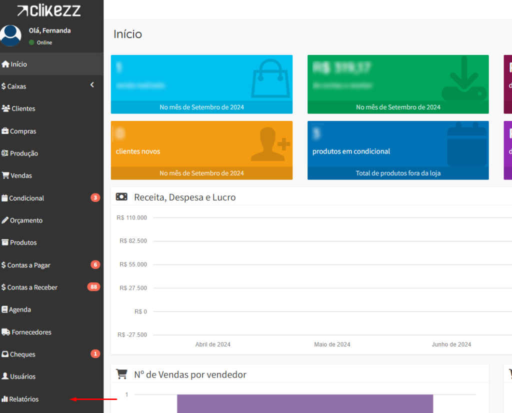 Para obter um relatório de vendas, primeiro clique em Relatórios, no menu lateral.