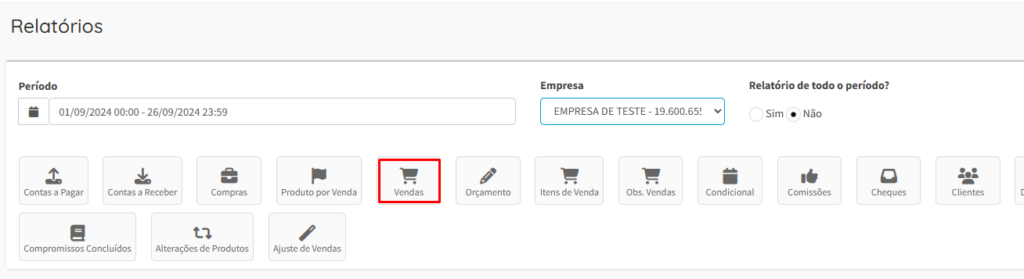 Depois, selecione o período desejado, a empresa em questão e clique em vendas