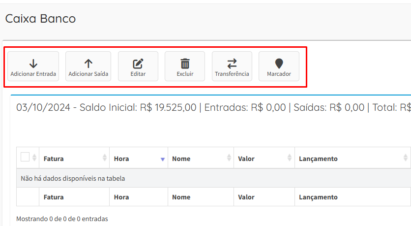Após isso, você será levado para uma tela onde você poderá adicionar entrada, saída, editar ou excluir alguma movimentação, realizar uma transferência entre dois caixas e também adicionar um marcador que dará destaque à movimentação selecionada.