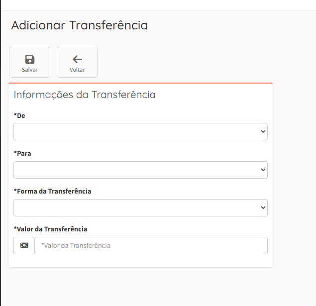 E a transferência também funciona de forma simples, bastando apenas selecionar e preencher os campos devidos e clicar em salvar.